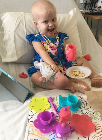 "Thank you for what you provide for these kids - in this case, the biggest smile for a two-year-old in the midst of a long day of chemo. This is Eve. She is 2 years old and has ALL. She is an inpatient this week for IV Methotrexate and after her Happy Wheels visit, she told people it was her birthday. She’s been visited by the Happy Wheels cart several times since her diagnosis in June but yesterday, she was convinced it was her birthday ... too much. We were tickled to see our sweet friend, Nancy Kendall, volunteering. One day when I am on the other side of this, I would love to be involved. It’s SUCH a bright spot on these long inpatient days!!" - Meredith Gvozdas, mother